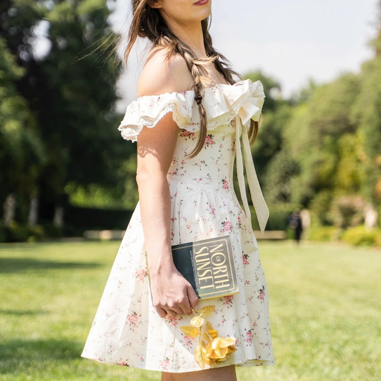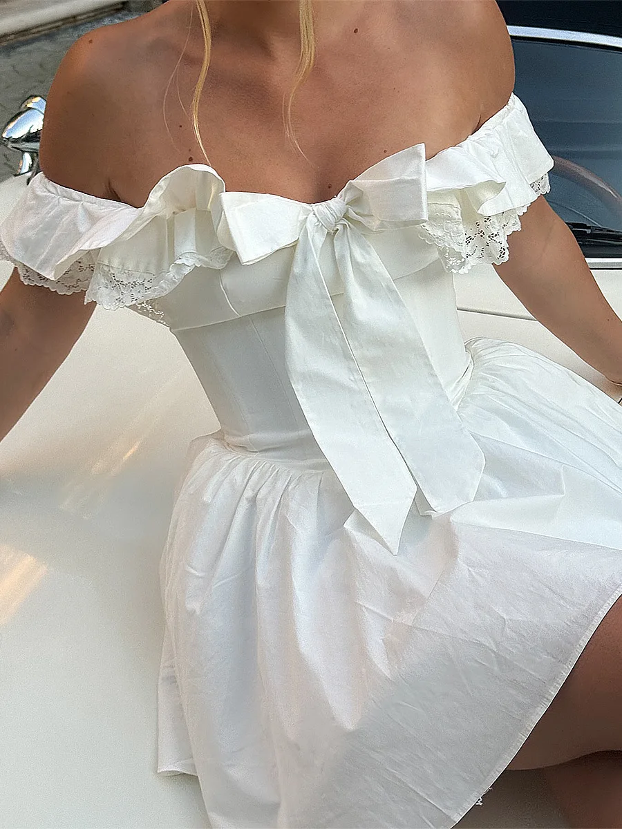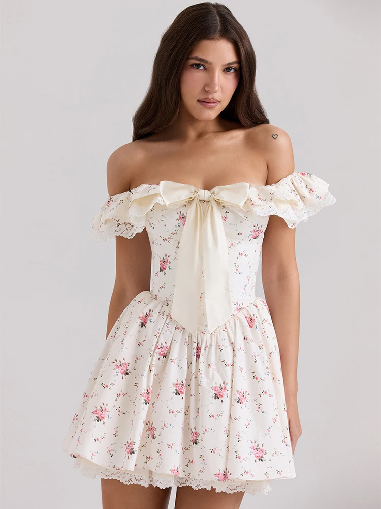 الفستان قصير بطول فوق الركبة (Mini)، بقصة A-line وسيلويت مستوحى من فساتين السهرة، مع ياقة مائلة (Slash Neck) تضيف لمسة أنثوية جريئة. التصميم بدون أكمام، مما يجعله خيارًا مثاليًا لفصل الصيف.