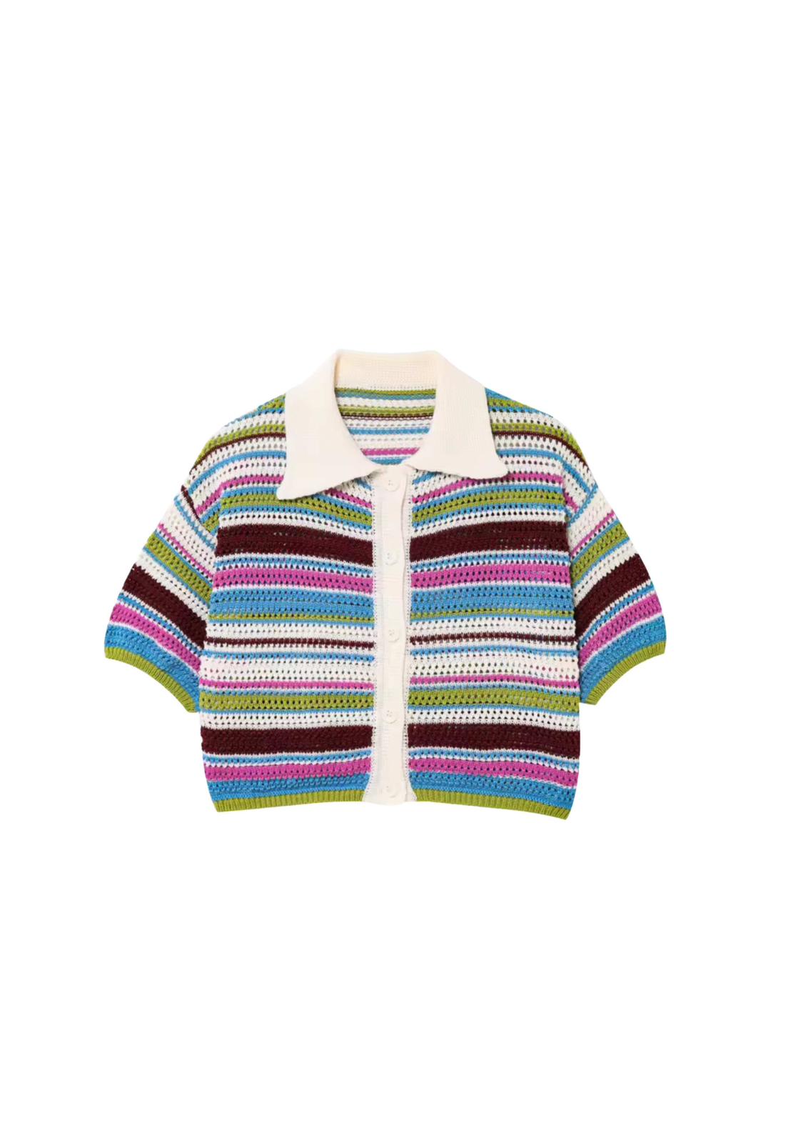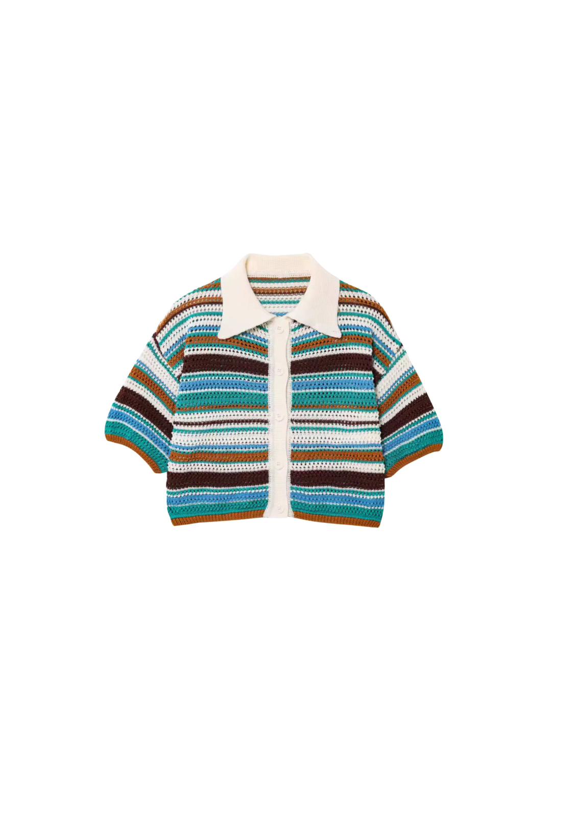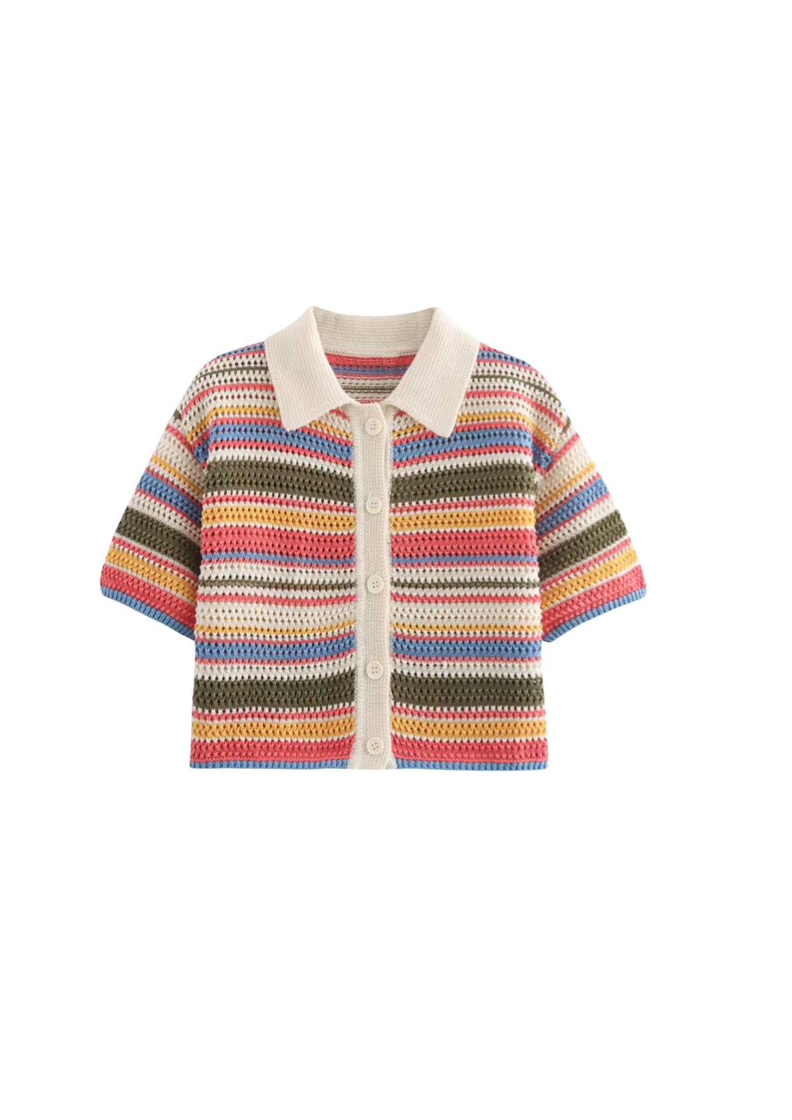 قميص كروشيه بتصميم مخطط وأكمام قصيرة، مزود بياقة كلاسيكية وأزرار أمامية، يمنحك لمسة أنيقة ومريحة لإطلالة عصرية
