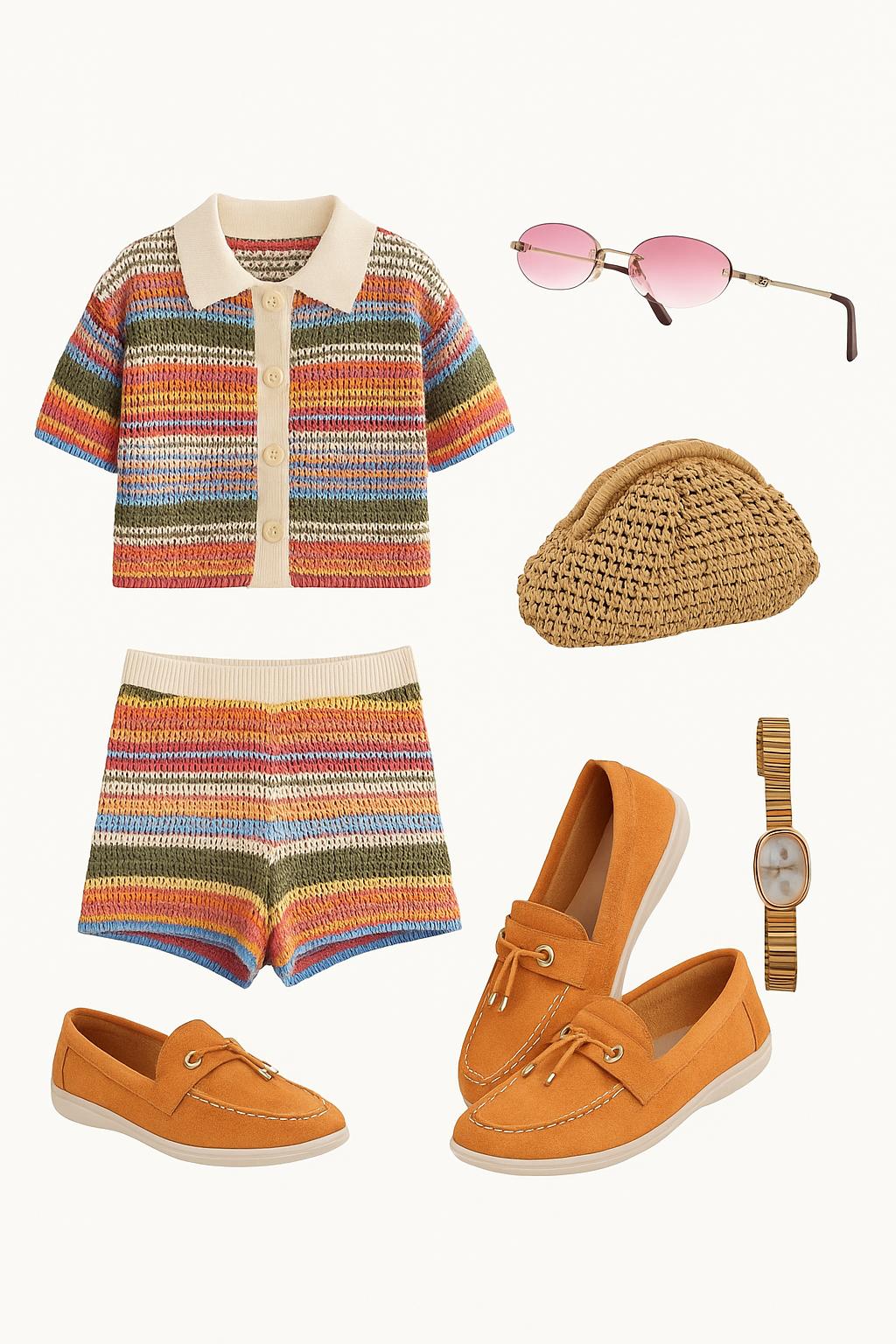 قميص بأزرار أمامية وشورت مريح من الكروشيه المحبوك يدويًا، بخطوط أفقية نابضة بالألوان التي تحاكي سحر غروب الصيف على الشاطئ. قماشه الخفيف يسمح للبشرة بالتنفس، مما يجعله خيارًا مثاليًا لأيام الشمس المشرقة ونسمات المساء اللطيفة.