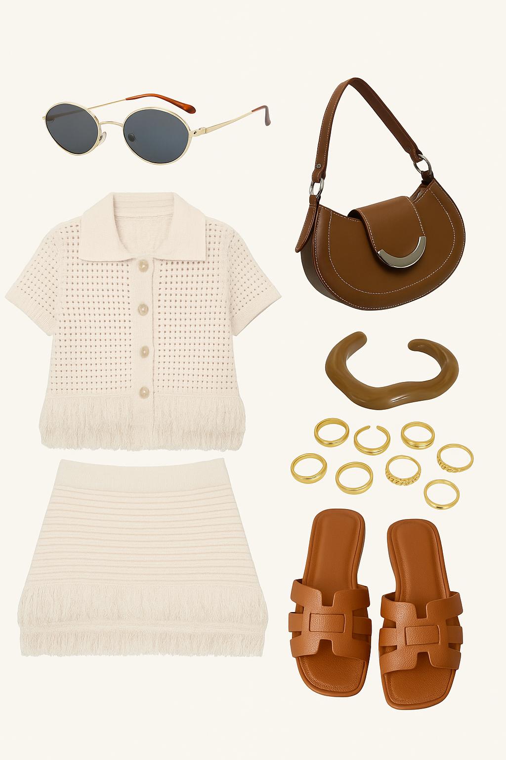 💫 النتيجة: إطلالة واحدة تجمع روح الصيف ورفاهية التفاصيل — تناسب جولات النهار الراقية، المقاهي العصرية، وحتى أمسيات الشاطئ الحالمة. كل قطعة تكمل الأخرى لتمنحك حضورًا يلفت الأنظار بلا مجهود.