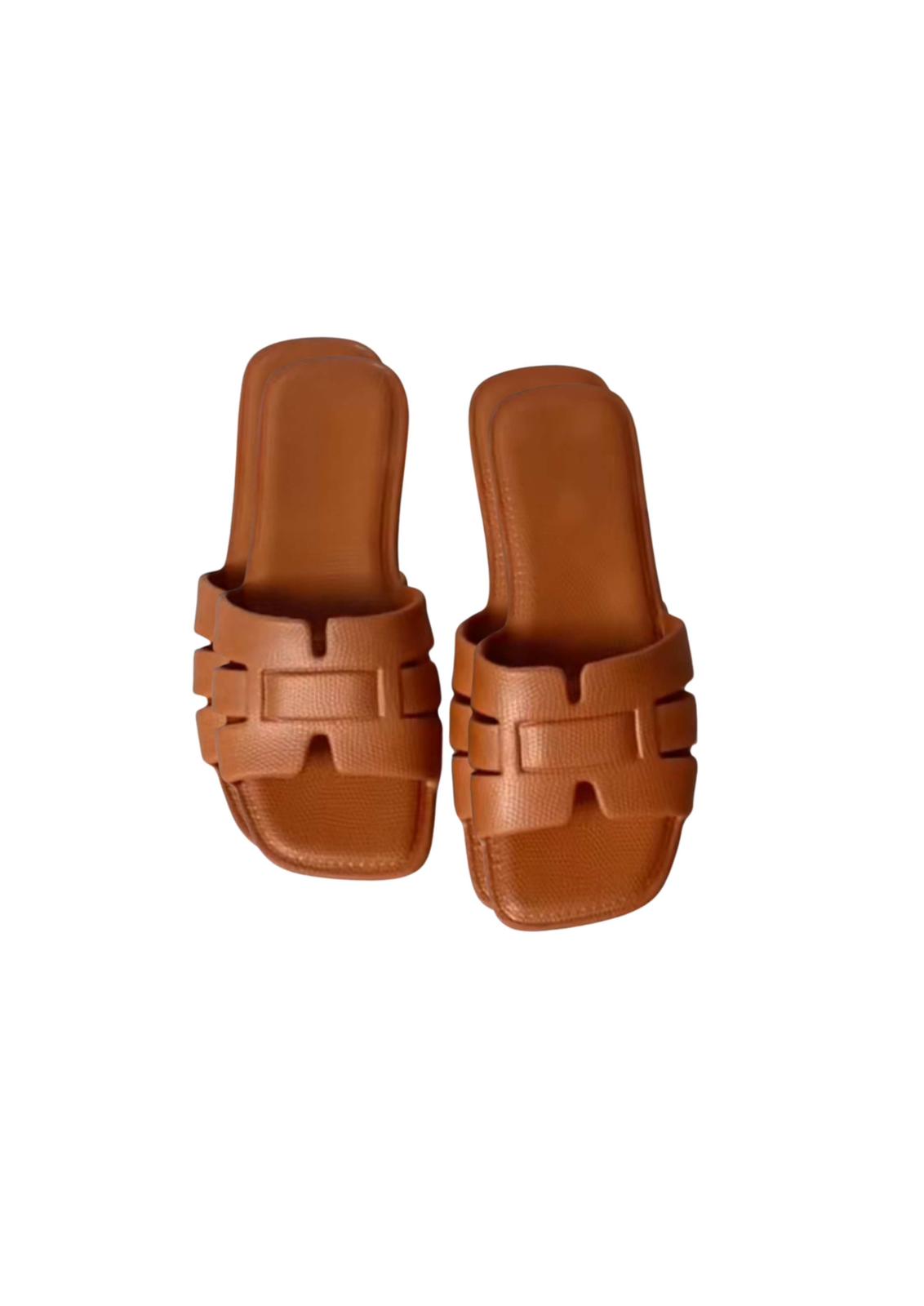 انطلقي بخطوات مريحة وأنيقة مع صندل مسطح من الجلد الطبيعي باللون البني الدافئ، بتصميم هندسي عصري يتماشى مع أجواء الصيف وحيوية الإطلالة.