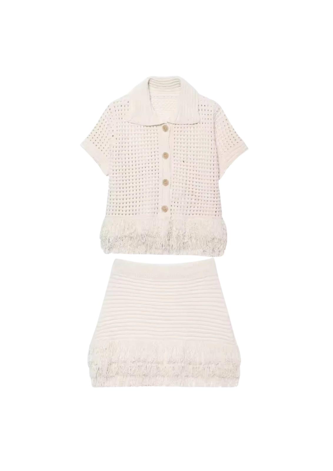 ابدئي يومك بخطوة واثقة مع طقم التوب والتنورة الكريمية المصمم من خامة مخرمة ناعمة تمنحك لمسة أنثوية راقية. التوب قصير الأكمام مزود بأزرار أمامية لؤلؤية تضيف لمسة كلاسيكية، أما التنورة فهي قصيرة بخطوط أفقية ناعمة وحافة مزدانة بشراشيب خفيفة تمنح الحركة جاذبية ساحرة.