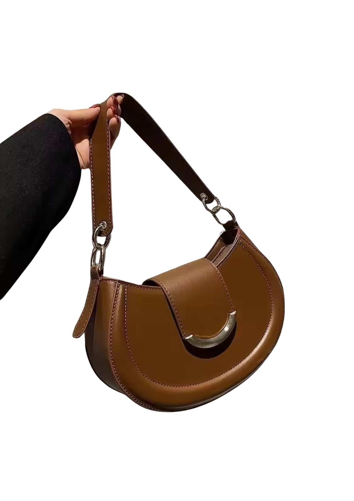 احملي أناقتك بين يديك مع حقيبة كتف بنية بتصميم هلالي معدني ذهبي يزين الإغلاق. حجمها المثالي وخطوطها الانسيابية يجعلانها قطعة أساسية لإكمال الإطلالة.