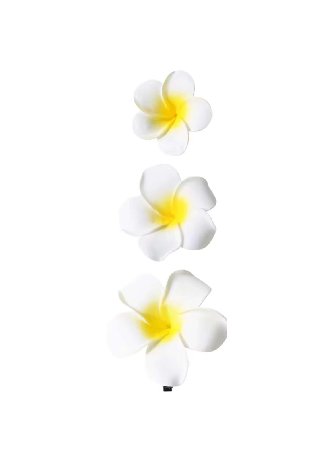 مشبك شعر بشكل زهرة بيضاء بلمسة صفراء في الوسط، يضفي إحساساً استوائياً وحراً وكأنك على شاطئ هاواي.