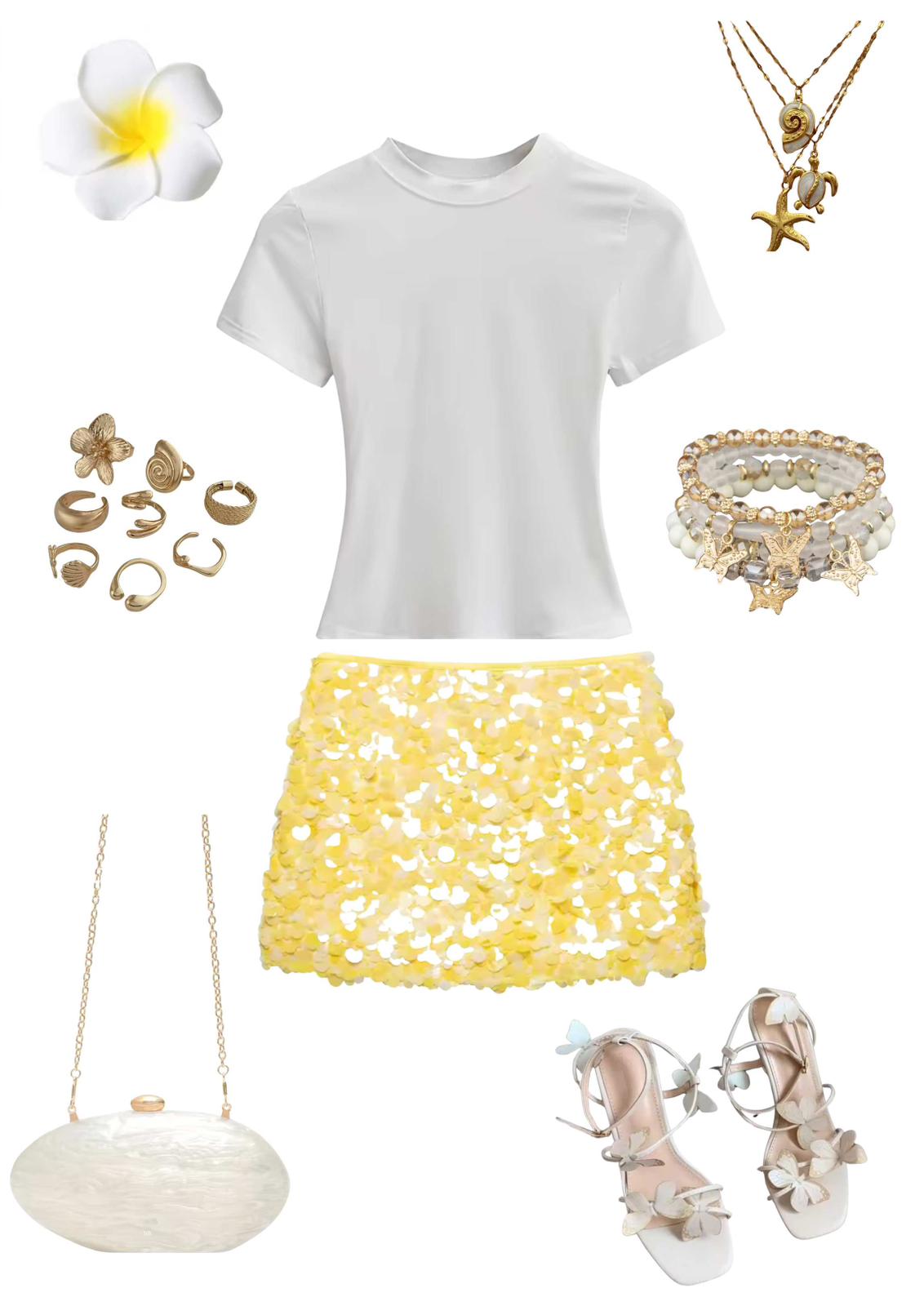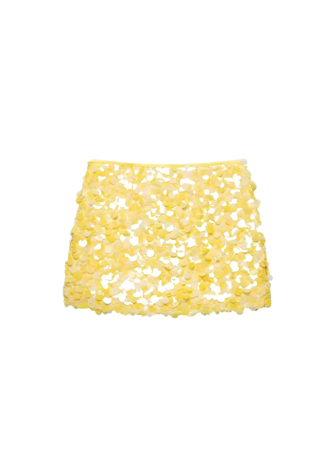 تنورة قصيرة من القماش المزخرف بالترتر الدائري المضيء، تعكس أشعة الشمس مع كل حركة، وتمنحك طاقة ومرحاً لا يقاومان.